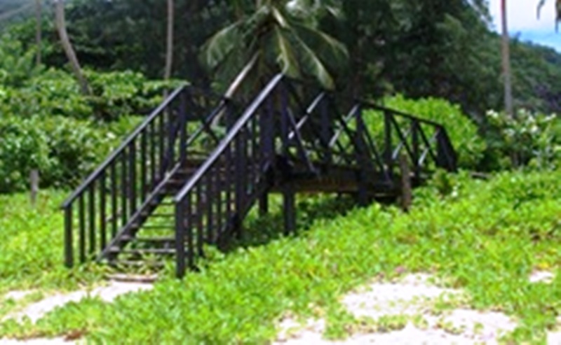 If you were to access the Grand Anse beach at present you will be welcomed by this wooden boardwalk with casuarina balustrade directing you to the boardwalk end which converts into a small hexagonal viewing area. The viewing area which is new to the boardwalk have been designed in mind of the beach users who wish to simply stand and look across the Grand Anse bay, take a breath of fresh sea air before settling on the white sandy beach itself. In front of this viewing area lies a stone masonry step leading to the beach itself. The stone masonry steps have been placed not only as steps but to act as a protective barrier to the base of the boardwalk in order to prevent scouring from wave attack which can undermine the boardwalk. The casuarina balustrade has been beautified further using white ship shankropes onto which the elderly and younger ones can hold onto while walking down the boardwalk.