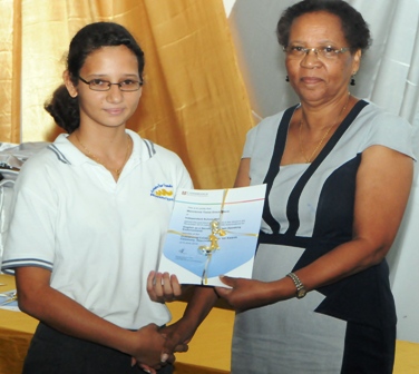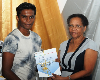 The three top achievers from Seychelles – (above) Tessa Mancienne, Sadsitha Lokuge and (below) Paul Gedeon receiving their certificate from Merida Delcy, principal secretary for early childhood, primary and secondary education