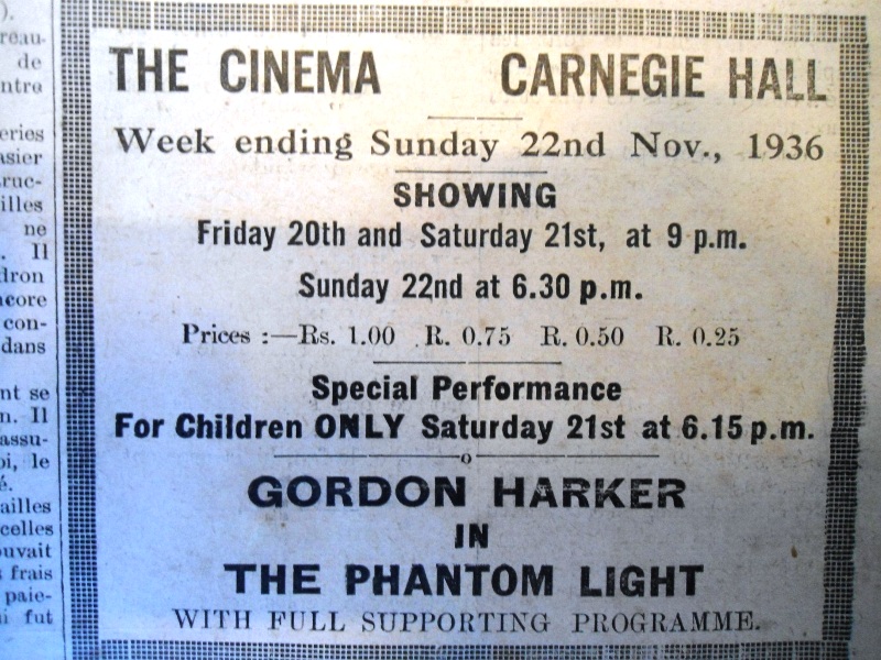 In the 1930s, the First Floor of the Carnegie Library which opened in 1910 was used for evening concerts, recitals and drama presentations. It was also the venue for movie projections which many inhabitants especially those who resided in Victoria enjoyed. At that time a movie was a privileged entertainment, a luxury!