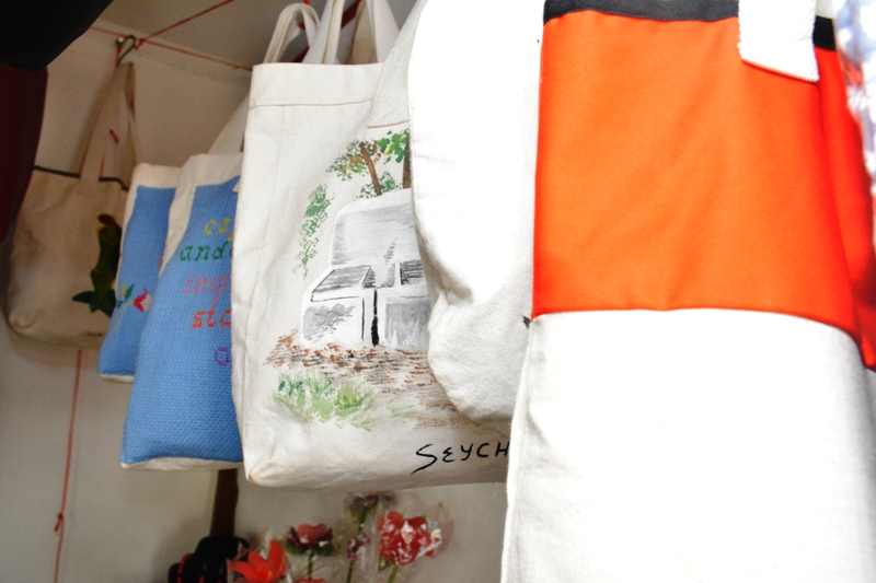 “I sew and design all my bags, caftans, shirts myself. All my items are locally made. The bracelets, pictures and frames, paintings on the vacoa bags are all made by an artist residing at Bel Air.”