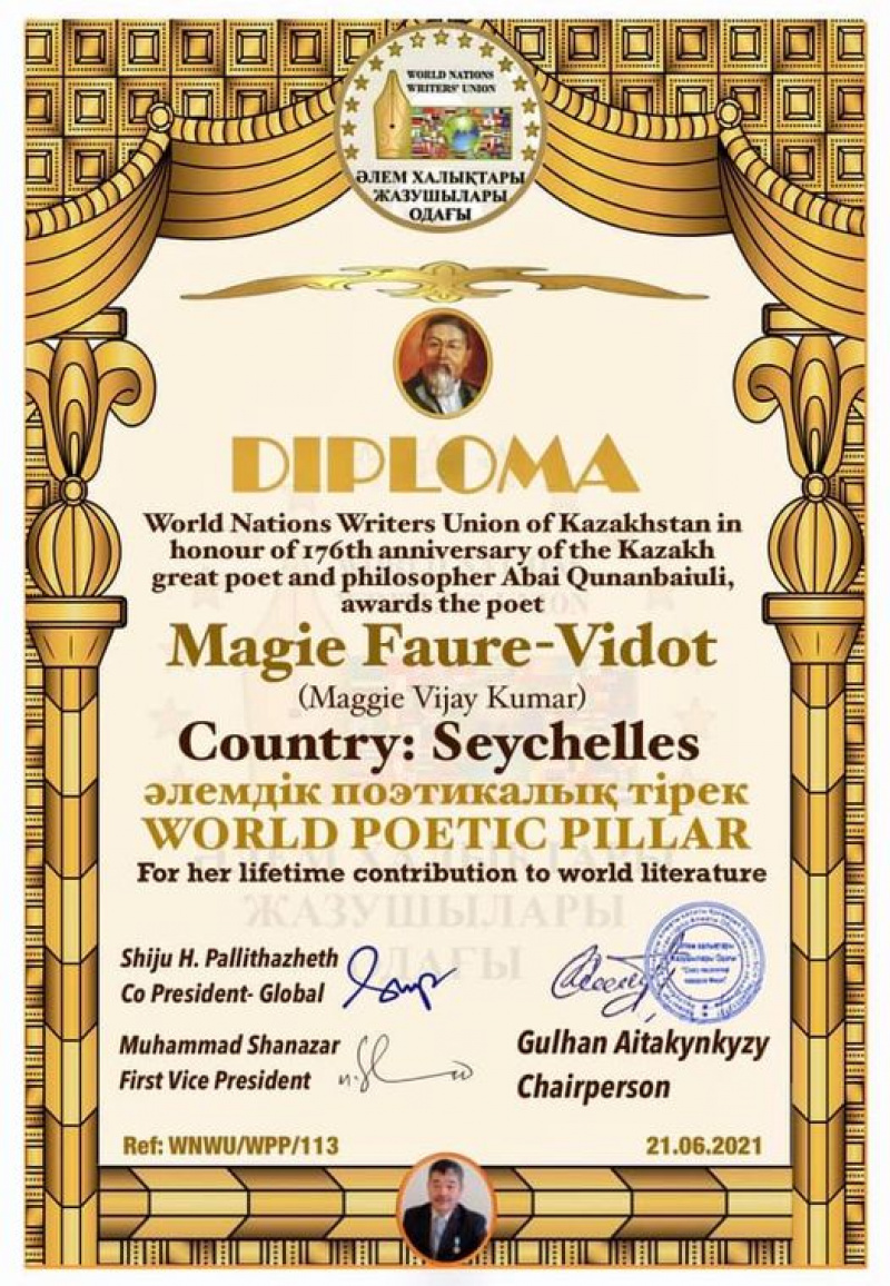 Seychellois poet Magie Faure-Vidot Vijay-Kumar recently featured among 22 poets and writers worldwide who were awarded the World Poetic Pillars Awards 2020-2021.