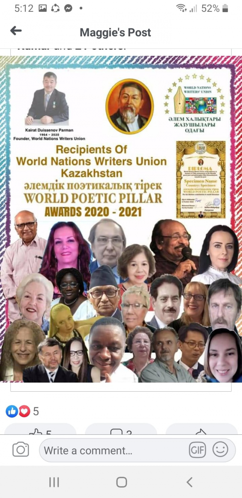 The awards, an initiative of the World Nations Writers Union (WNWU), were in honour of the late Kazak founder of the union poet, composer, translator, songwriter and journalist Kairat Duissenov Parman.