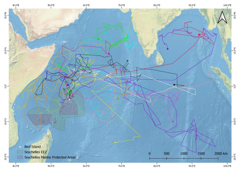 Following the initial move to the north of Bird Island, all of the birds eventually dispersed more widely, with individuals reaching the Arabian Sea, the Mozambique Channel, the 90-east Ridge and the huge Chagos Marine Protected Area; all of these areas had been earlier shown to be of importance to Bird Island’s adult Sooty Terns out of the breeding season.