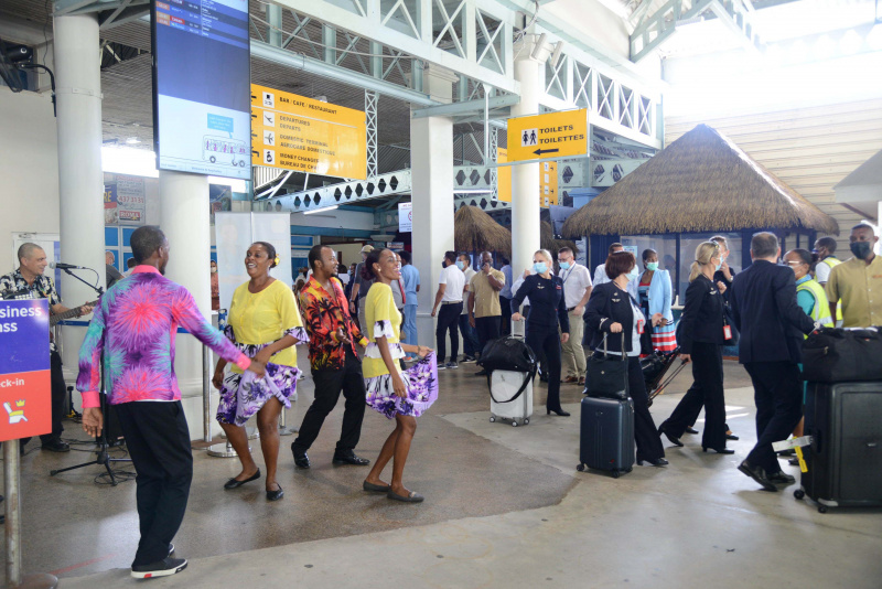 The 203 guests flying in from France on this first flight were given a taste of creole hospitality as they received local souvenirs from the department of Tourism and experienced the lively spirit of the Seychellois through live traditional music.