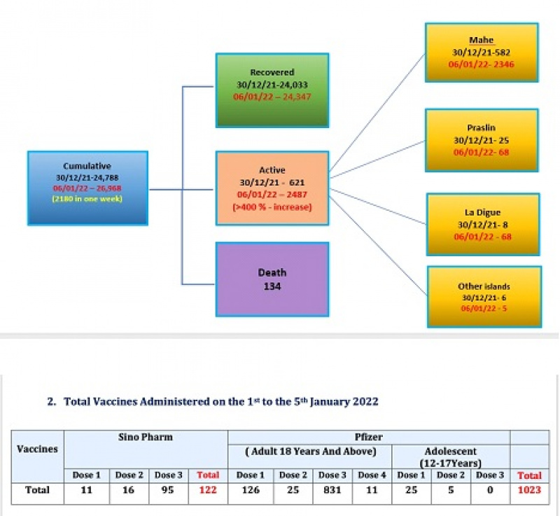 As at yesterday there were 2346 cases on Mahé compared to 621 on December 30, 2021; 68 cases on Praslin compared to 25 cases on December 30, 2021; 68 cases on La Digue compared to 8 cases on December 30, 2021 and 5 cases on other islands.
