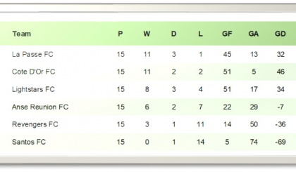 La Passe collected 11 wins, three draws and a loss in 15 games, while Côte d’Or finished with 35 points after 11 victories, two draws and two defeats. Third-placed LightStars amassed 27 points from eight wins, three draws and four losses.