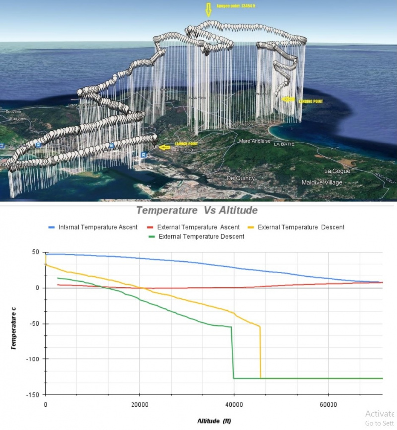 Temperature data: The accompanying graph represents the data from two temperature sensors placed inside and outside the balloons. The internal temperature sensor was measuring the temperature inside the payload box which was regulated using onboard chemical heaters while the external temperature sensor was measuring the ambient temperature of the upper atmosphere. The lowest temperature recorded was -60 degrees Celsius. The unit of temperature is noted in Celcius.