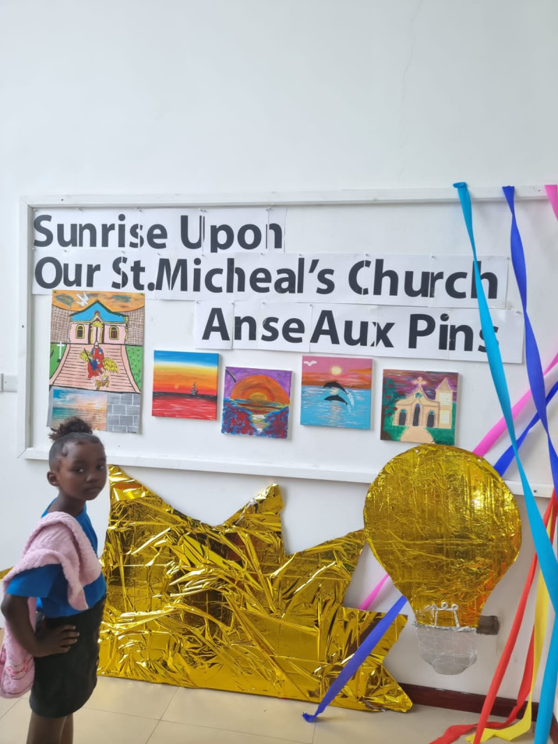 Our parish is so happy to be celebrating 170 years of our St Michael’s Catholic Church in Anse Aux Pins! For this occasion, two exhibitions have been organised. The first one was held last Sunday after the 9am mass where the children of KFC expressed themselves with their paintings about the story of St. Michael, entitled, ‘Sunrise Upon St. Michael and Anse Aux Pins!’
