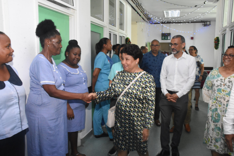 Dr Robert Michel, from the department of Gynecology and Obstetrics, welcomed the tour, stating the annual visits to the pediatrics unit and maternity ward have become a heartwarming tradition. “Particularly for the maternity ward, one of the largest in the hospital. Every year, the media coverage of these visits warms the hearts of the Seychellois people,” he said. The unit had five patients who were awaiting delivery on Saturday and 17 who have already delivered.