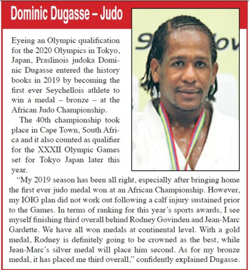 “My 2019 season has been all right, especially after bringing home the first ever judo medal won at an African Championship. However, my IOIG plan did not work out following a calf injury sustained prior to the Games. In terms of ranking for this year’s sports awards, I see myself finishing third overall behind Rodney Govinden and Jean-Marc Gardette. We have all won medals at continental level. With a gold medal, Rodney is definitely going to be crowned as the best, while Jean-Marc’s silver medal will place him second. As for my bronze medal, it has placed me third overall,” confidently explained Dugasse.