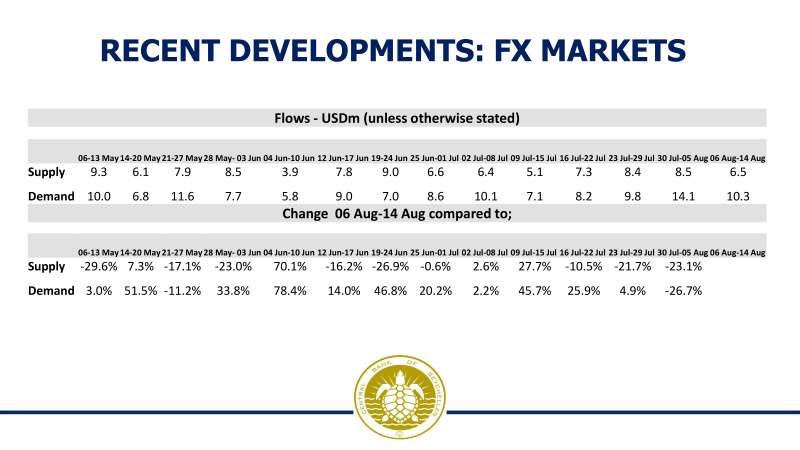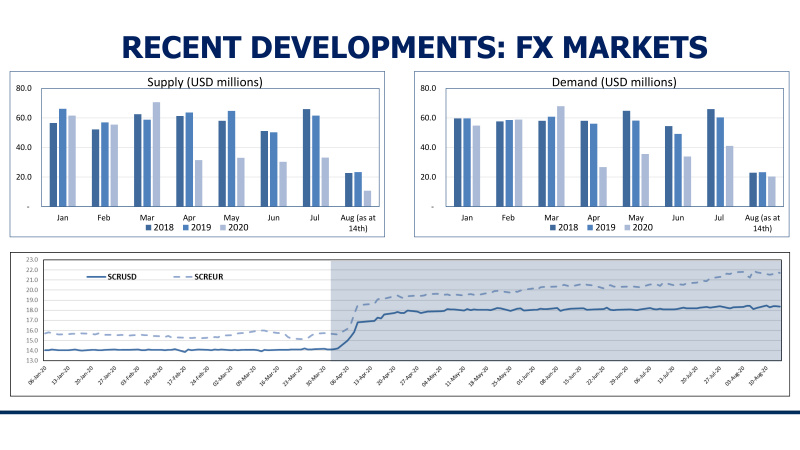 She explained that despite a drop of R3.8 million in the demand for foreign exchange, the appetite for same remain on the high side and she noted that the supply of foreign exchange on the local market continued to follow a downward trend, precisely from USD 8.5 million on August 6, 2020 to USD 6.5 million on August 14, 2020.
