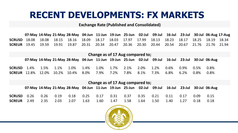 From April to August a total of USD 6 million and USD 7.2 million was sold to the Seychelles Trading Company (STC) and Seychelles Petroleum Company (Seypec) respectively from the international reserve and as at the period under review Gross International Reserve (GIR) was USD 588 million and Net International Reserve (NIR) was USD 441 million which as forecasted will last for as long as possible.
