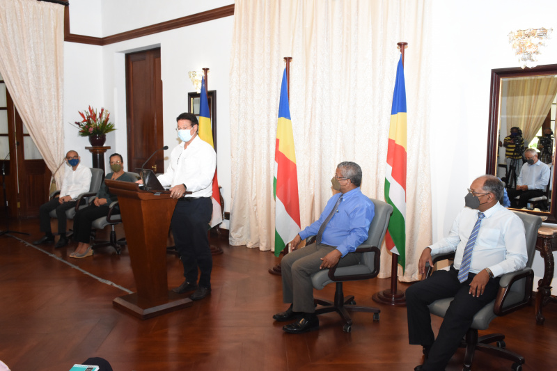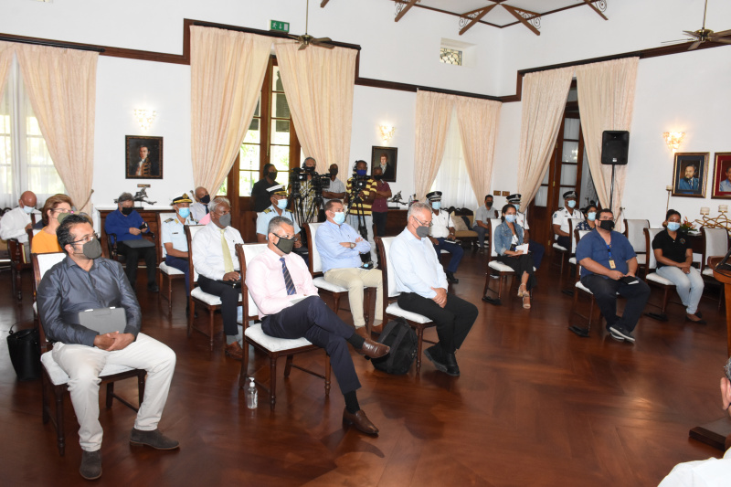 Also present at State House for the meeting was Vice-President Ahmed Afif; the Designated Minister and Minister for Fisheries and the Blue Economy, Jean-François Ferrari; the Minister for Foreign Affairs and Tourism, Sylvestre Radegonde; the Minister for Health, Peggy Vidot; the Minister for Internal Affairs, Roy Fonseka; the Minister for Finance, Naadir Hassan; the Minister for Community Development, Rose-Marie Hoareau; the Commissioner of Police, Kishnan Labonte; the Attorney General, Frank Ally; the principal secretary for Health, Dr Bernard Valentin; the chief executive of the Health Care Agency, Dr Danny Louange; SPDF Chief of Defence Forces (CDF), Col. Michael Rosette; SPDF Chief of Staff. Col. Simon Dine; the principal secretary of DRDM, Paul Labaleine; the senior policy adviser in the Ministry of Health, Dr Conrad Shamlaye; Deputy Commissioners of Police, Romano Songore, and Ted Barbe.